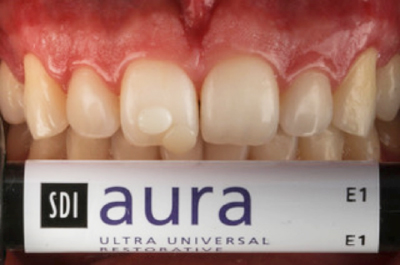 Para a realização dos procedimentos restauradores diretos com resina composta Aura Ultra Universal Restorative da SDI (imagem 18) selecionou-se a cor deste compósito fotoativando pequenos incrementos diretamente sobre o dente intocado, hidratado e sob luz natural.