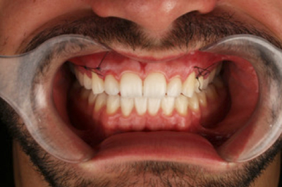 Imagem 17: Foto frontal pós cirurgia periodontal com afastadores laterais.