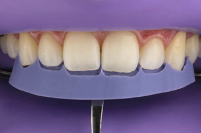 Uma vez ocorrida a cicatrização, realizou-se moldagem das arcadas e procedeu-se ao enceramento sobre modelo, guia em silicone e mock’up. Feitos os ajustes intra-orais, confeccionou-se uma guia palatina com silicone de adição (DMG) para orientar o procedimento restauradores diretos em boca.