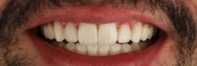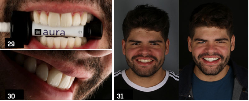 O dente 11 foi restaurado com as mesmas resinas seguindo o mesmo protocolo e, estando o arranjo satisfatório demos início aos procedimentos estéticos complementares nos incisivos laterais. Nestes dentes realizou-se, com pequenos acréscimos de resina composta, complementação na borda incisal para reduzir a percepção da mordida aberta anterior remanescente do tratamento ortodôntico. Para tanto utilizamos a mesma sequencia de resinas. Já nos caninos e pré-molares o acréscimo foi apenas vestibular para modificação de formato e principalmente eixo de dente, sem nenhum acréscimo incisal.Para o acabamento destas restaurações utilizou-se discos e brocas de ponta diamantadas f e ff, polimento usando borrachas espirais Swivel (Jota Do Brasil).Por fim, repetiu-se o protocolo fotográfico realizado na primeira consulta de planejamento para facilitar a comparação dos resultados obtidos com o tratamento. (imagem 27, 28, 29, 30 e 31).