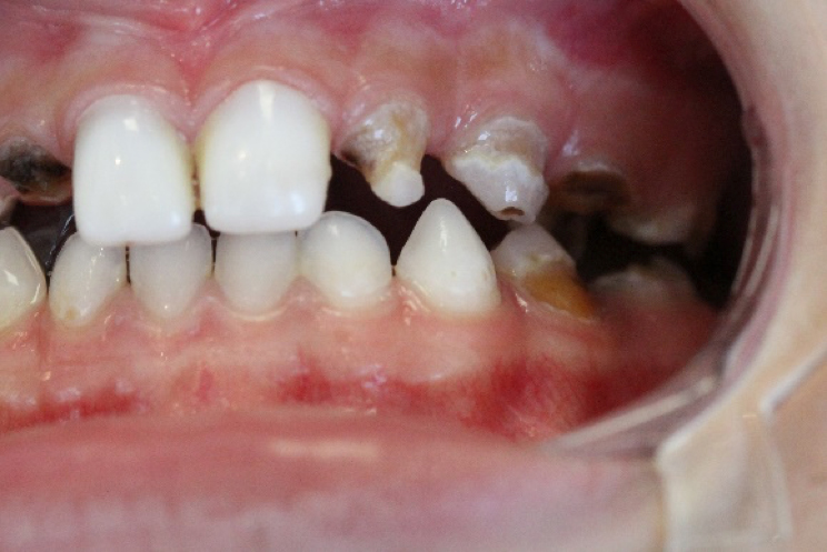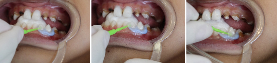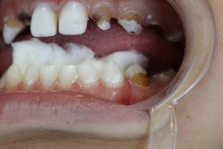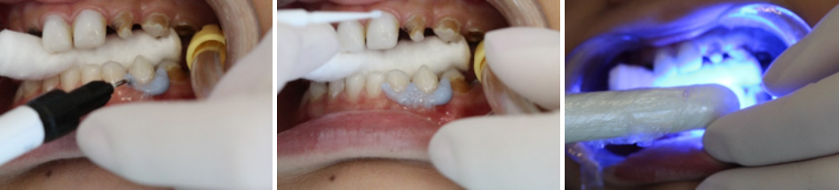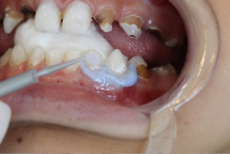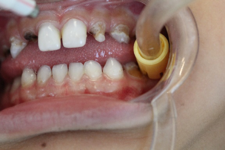 Paciente do sexo masculino, 7 anos de idade, compareceu ao consultório acompanhado pela mãe que se queixava de muitas lesões de cárie nos dentes de seu filho. Após anamnese, exame clínico observou-se presença de lesões de mancha branca nos elementos 72 e 73. (foto 1 e 2)